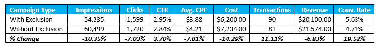 As suspected, the campaign with the exclusion was lower volume, but produced much more qualified traffic. Conversion rate improved by 20%.