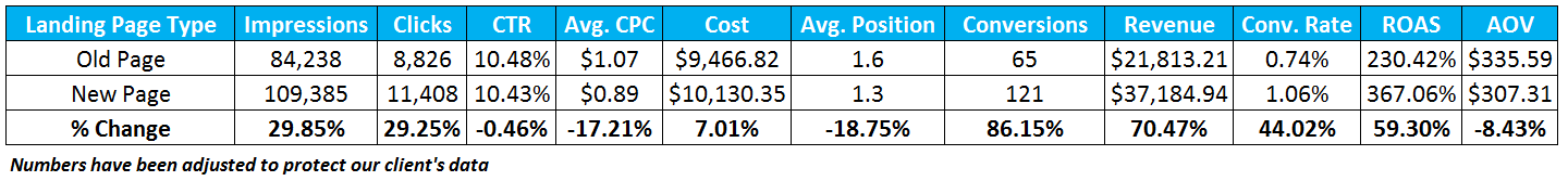 We also reviewed impression share, Quality Score, and average CPC differences between the two pages, which can be seen in the following table: