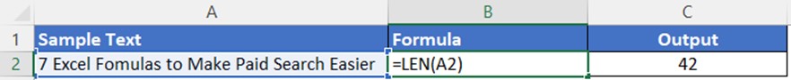 When crafting ad copy, character limits matter. For example, when creating a responsive search ad (RSA), each headline can have a maximum of 30 characters and each description a maximum of 90 characters. The =LEN formula will help you ensure your text fits within the character limits of ad platforms like Google Ads, by outputting the character length of text in a given cell.