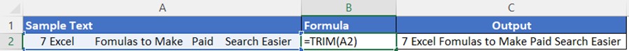 The =TRIM formula is valuable for PPC digital marketers because it enables you to efficiently remove leading and trailing spaces, ensuring consistency in your data. When writing ad copy or downloading large datasets, extraneous spaces can lead to discrepancies and errors in your campaigns. This formula is a quick way to clean up and normalize text data, saving yourself the hassle of errors down the road.