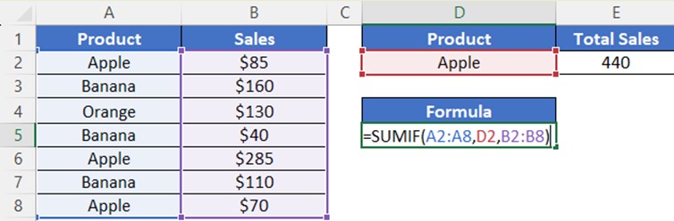 In this example, =SUMIF(A2:A8,D2,B2:B8) sums the values in column B when the corresponding value in column A matches the text in cell D2, in this case, “Apple”.