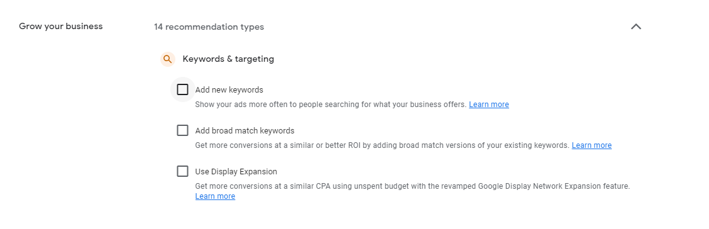 Google provides an array of standard recommendations that will be automatically applied to your account if you do not opt out of settings. These settings can drastically impact your account performance, account spend, and efficiency. Below includes several settings that we recommend opting out of.