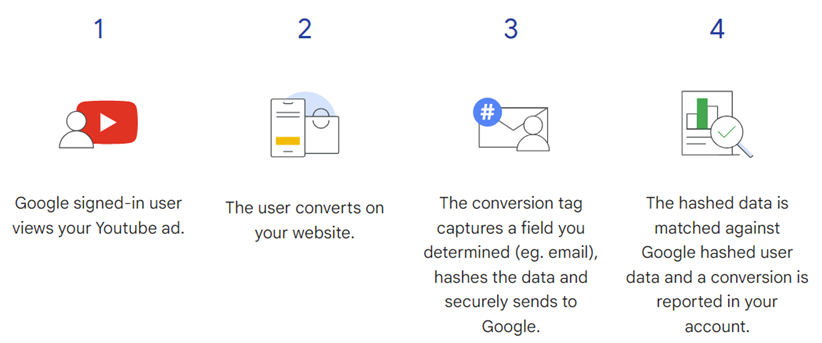 When a user is signed into their Google profile, clicks on an ad, and converts on your site, Google then captures their user information, hashes the data, and securely sends this data back to Google Ads to record a conversion. If the user is not signed into a Google Account, first party data will not be passed back and Google will instead rely on the existing conversion tracking.